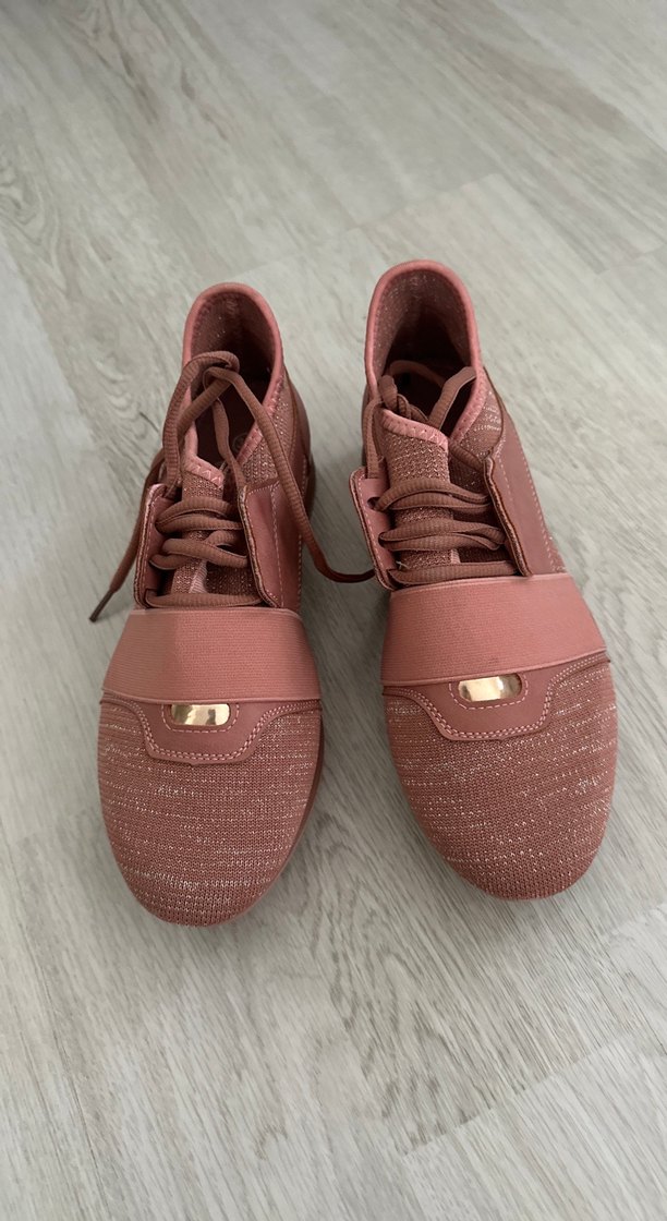 Pembe, bağcıklı, dolgu topuklu kadın spor ayakkabısı. Parlak kauçuk malzemeden, günlük sokak stili için uygundur.