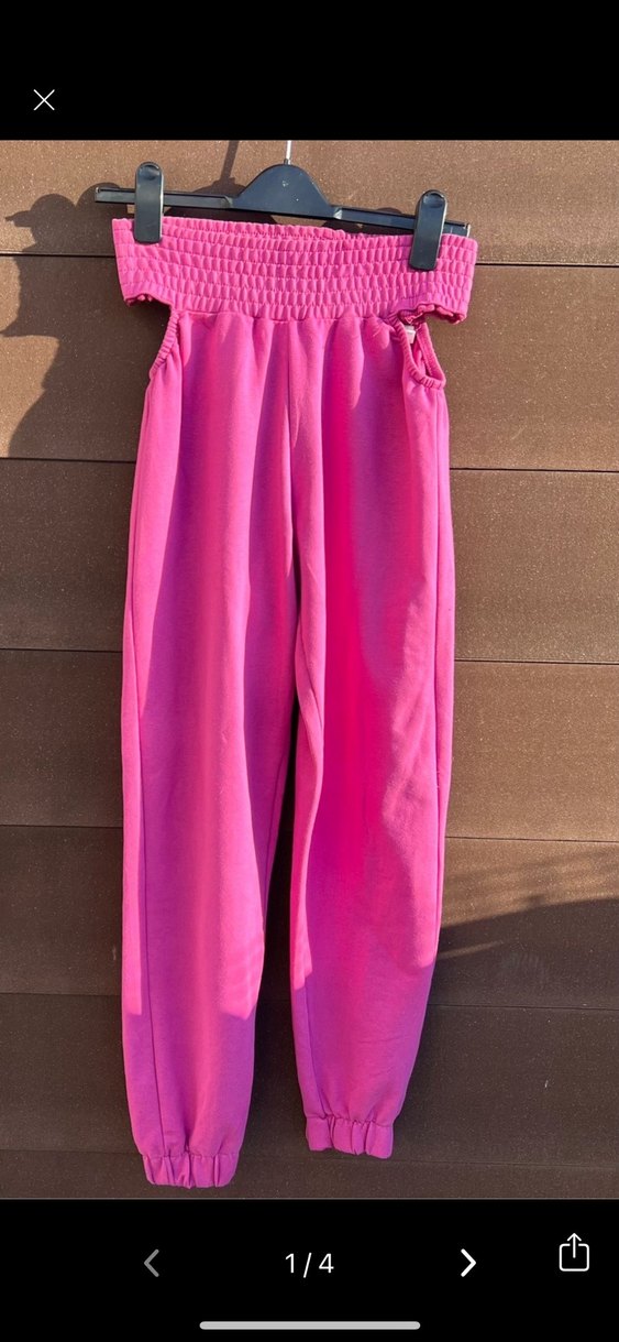 Pembe bağcıklı, bol kesim kadın eşofman altı. Yumuşak sentetik kumaştan, pastel tonlarda batik desenli, günlük rahat kullanım için uygun.