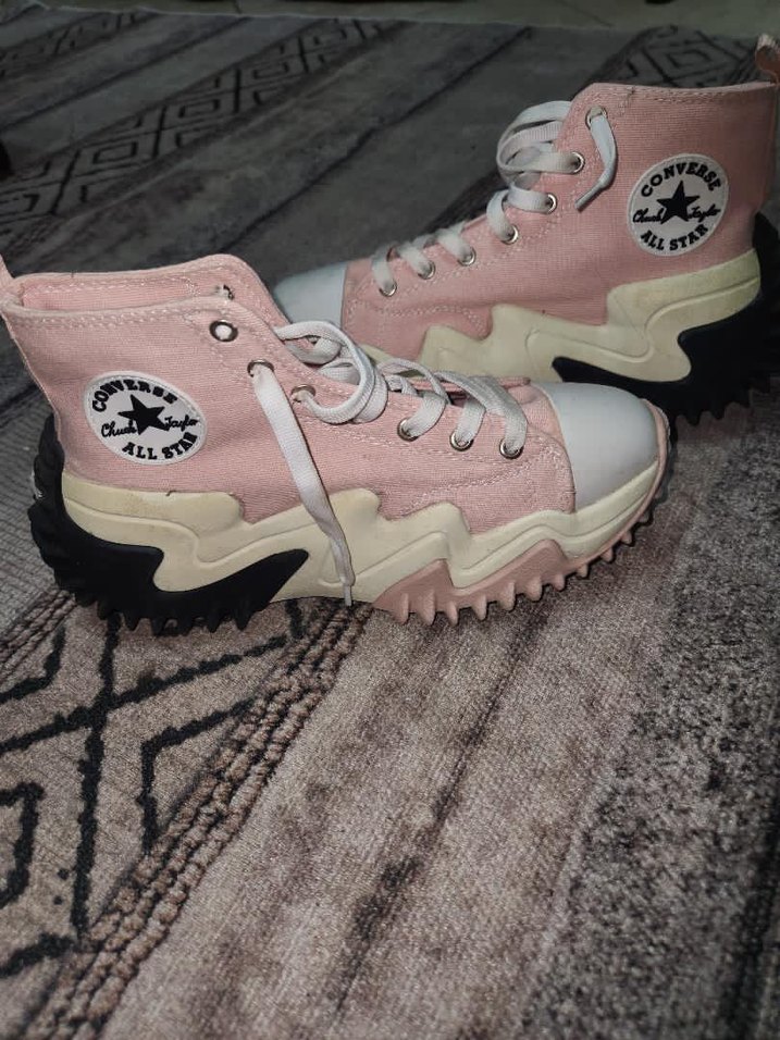 Pembe Converse All Star yüksek tabanlı spor ayakkabılar, fırfırlı detay ve pastel tonlarda tie-dye desenle sokak modasına uygun.ORİJİNAL ÜRÜNDÜR