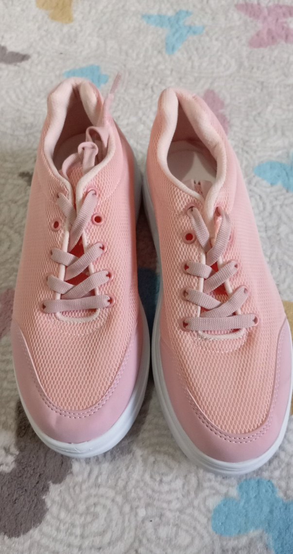 Pastel pembe, bağcıklı, düz tabanlı kauçuk kadın spor ayakkabısı. Nefes alabilen üst yüzeyle rahat süngerli