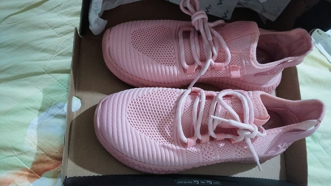 Pembe bağcıklı kadın spor ayakkabısı, ince topuklu ve kauçuk tabanlı. Pastel tonlarda, desen içermeyen, nefes alabilen üst yüzeye sahip, spor sokak stiline uygun.
