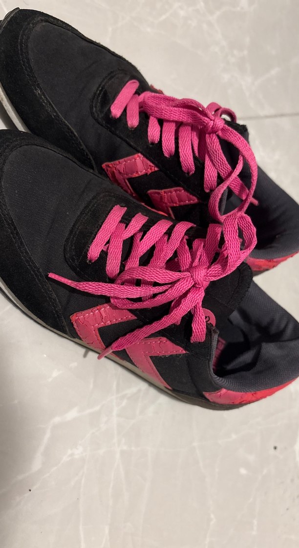 Koyu renkte, pembe bağcık ve detaylara sahip kadın spor ayakkabısı. İnce topuklu ve elastik yapısıyla sokak stili ve spor şıklığını bir arada sunar.