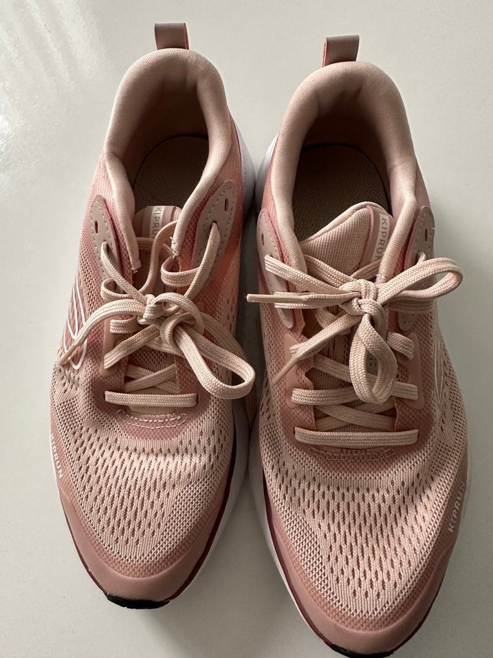 Pastel pembe renkte, bağcıklı ve ince topuklu kauçuk tabanlı kadın spor ayakkabısı. Sokak stili ve spor için uygundur.