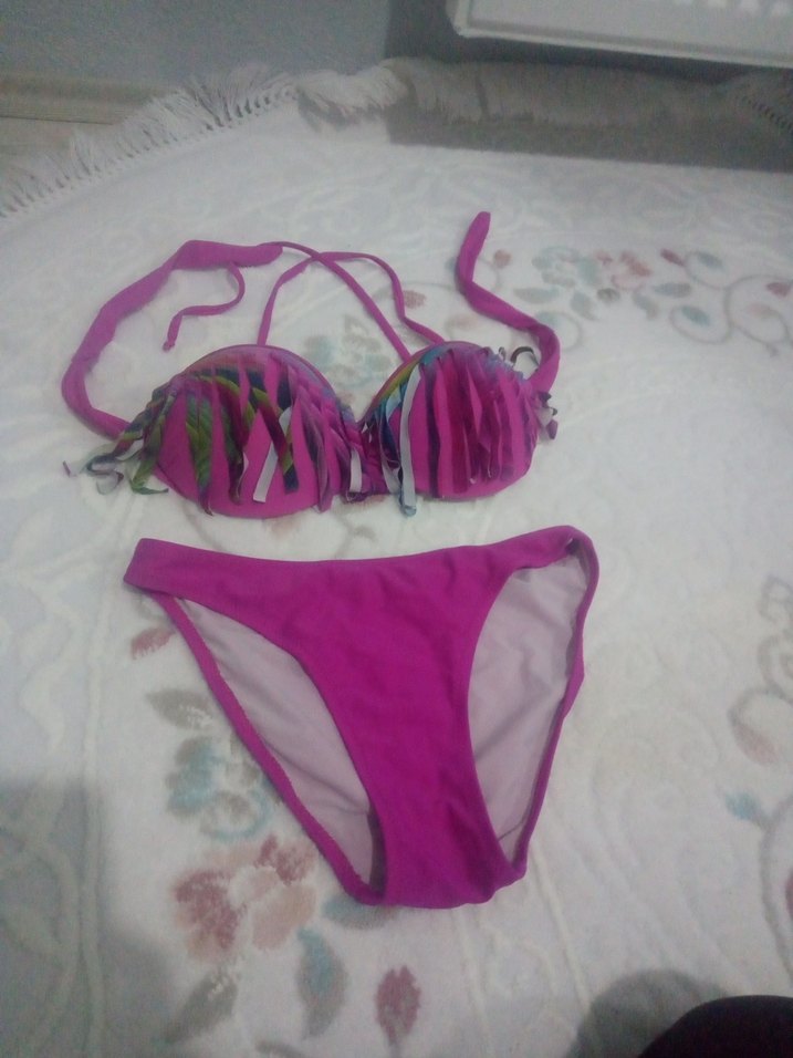 Renkli pembe bikini, bağcıklı üst kısmı ve dantel detaylarıyla, mini ve vücuda oturan alt kısmıyla cesur bohem plaj tarzına uygundur.