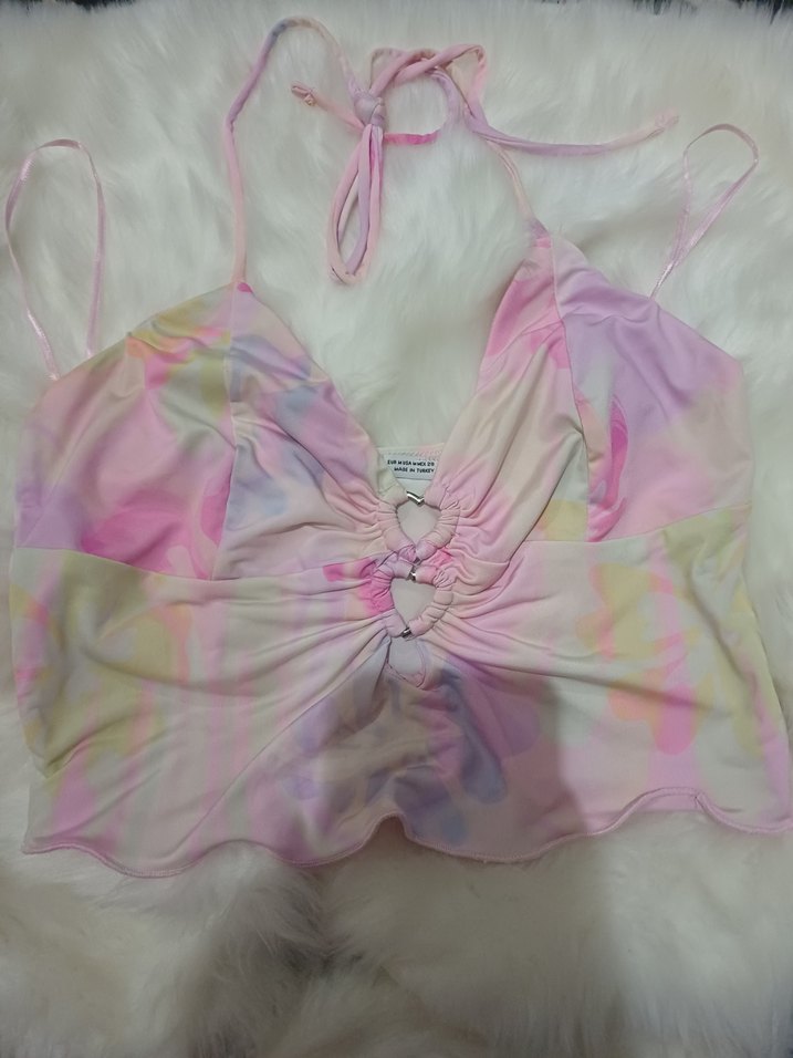 Pastel pembe tie-dye desenli, ince askılı, V yakalı, oturan kesim mini büstiyer. Fırfır detaylı, bohem parti tarzına uygun.