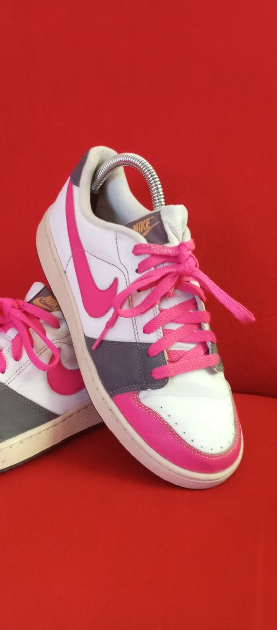 Pembe bağcıklı Nike kadın spor ayakkabısı, blok topuklu ve bağcık detaylı, gri tie-dye desenli kauçuk malzemeden üretilmiştir.