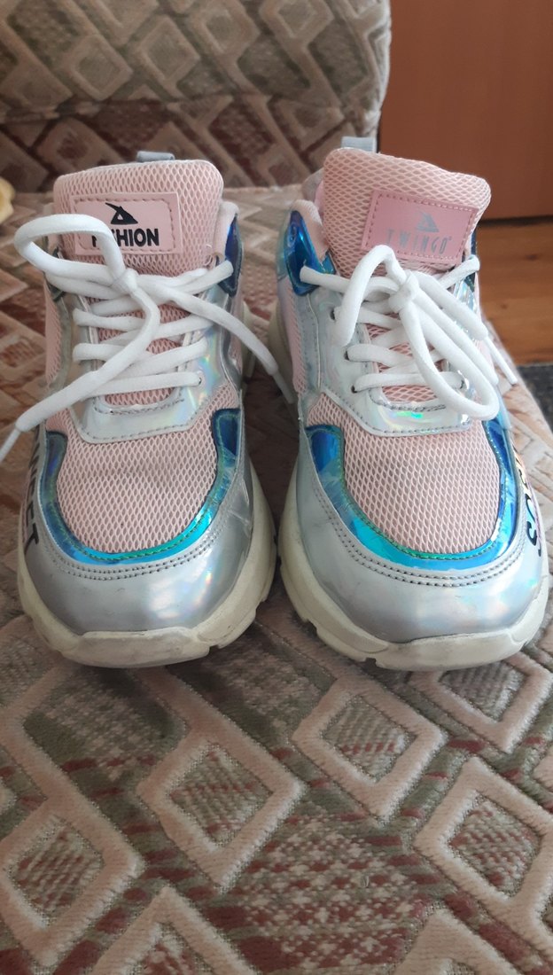 Pastel pembe bağcıklı ve stiletto topuklu spor ayakkabılar, sokak stili ve spor görünümü birleştirir. Kauçuk malzemeden ve batik desenlidir. HION etiketi vardır.