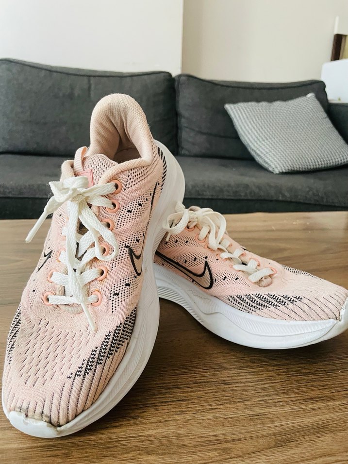 Pembe bağcıklı, bağcıklı ve stiletto topuklu kadın spor ayakkabıları, kauçuk malzemeden üretilmiştir ve pastel tonlarda batik desenlidir.