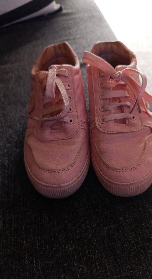 Pastel pembe renkte, bağcıklı tasarıma sahip, lastik malzemeden yapılmış kadın spor ayakkabısı. hamur ayakkabı Günlük kullanım için uygundur.