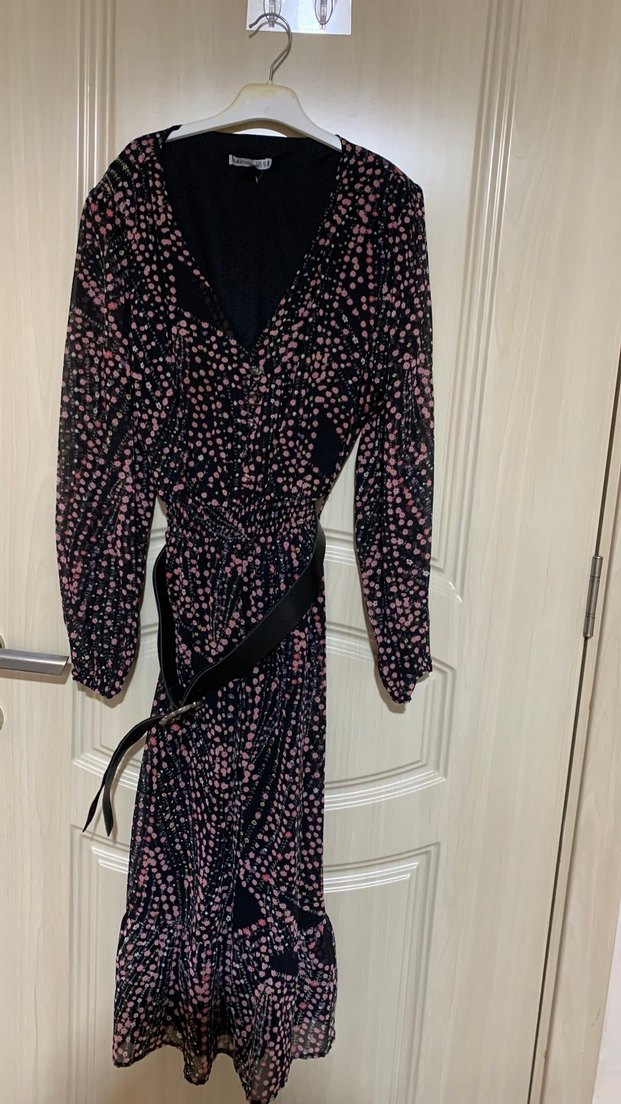 Bu uzun kadın elbisesi koyu pembe tie-dye desenli, V yaka ve askılı kolludur. Bol kesim ve belde kuşaklıdır, günlük kullanım için uygundur. Kemeri fotoğrafta göründüğü gibi iyi durumda değil