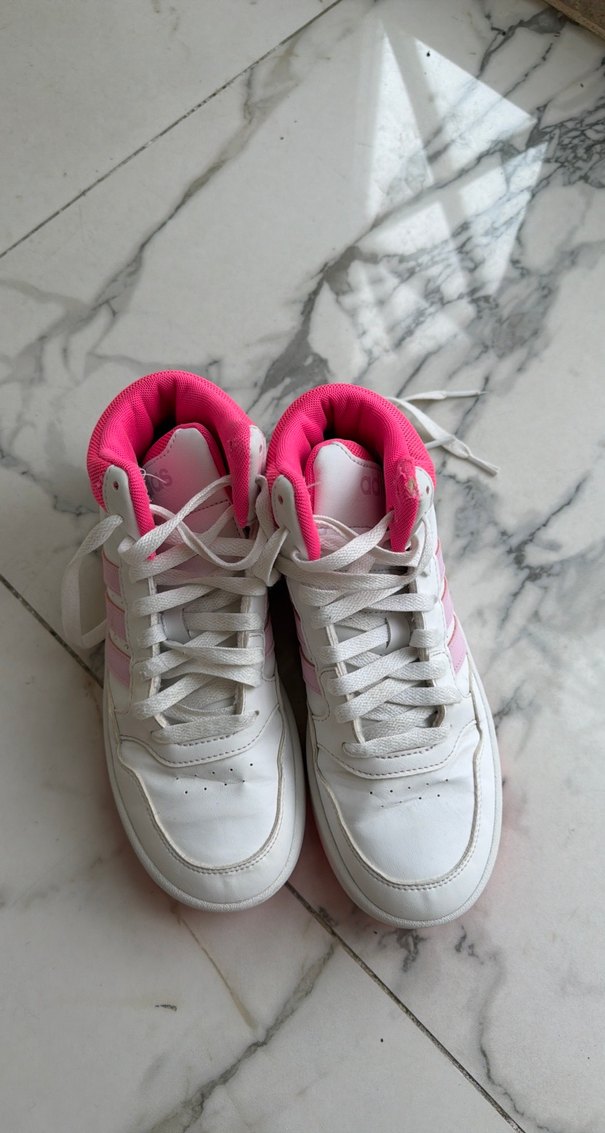 Beyaz dış yüzeyi ve pembe iç astarıyla yüksek top kadın spor ayakkabısı, bağcıklı ve kauçuk tabanlıdır.