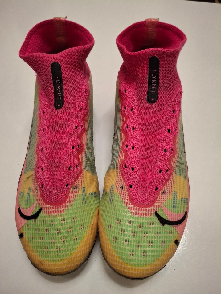 Canlı renkli bağcıksız örgü üst kısmı ve renkli tie-dye deseniyle pembe erkek futbol ayakkabısı. Kauçuk taban dayanıklılık ve tutuş sağlar. ⚽