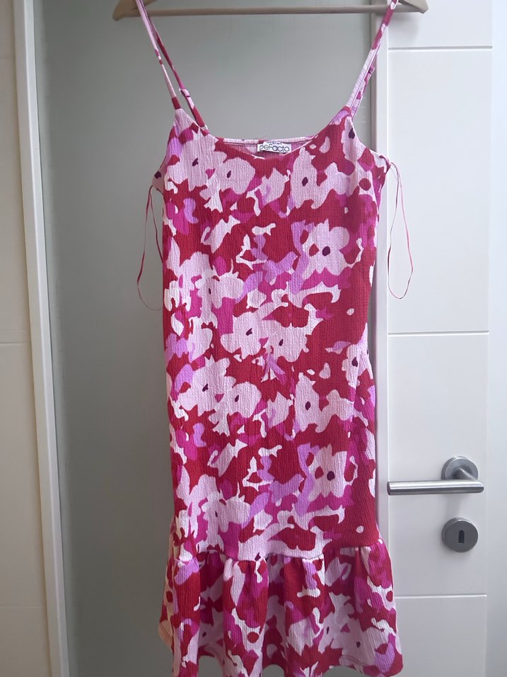 Bu açık pembe bağlama desenli midi elbise, ince askılı straplez yaka, bol kesim ve etek kısmında fırfır detayına sahiptir. Yumuşak sentetik kumaştan yapılmıştır, dış mekan sokak modası için uygundur. Boy 72
