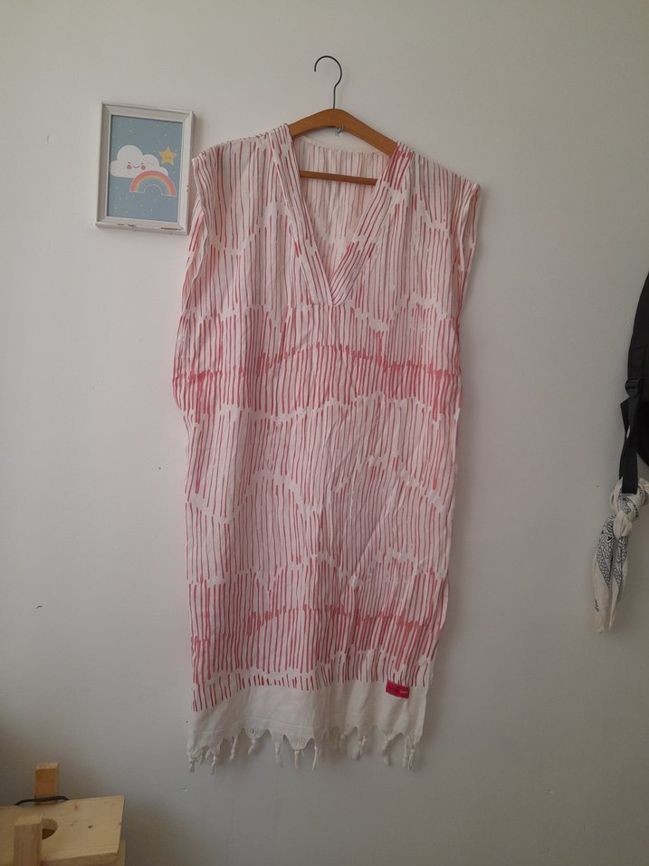 Hafif pembe tonlarda, bağlama desenli bohem tarzda kadın pareo. Yumuşak kumaştan, püsküllü kenarlarla rahat bir görünüm sunar.