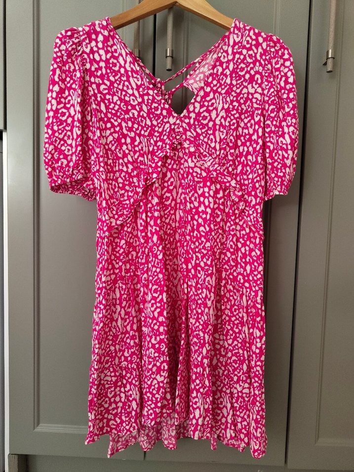V yaka ve askılı kollara sahip, bol kesim midi elbise. Canlı pembe bağlama desenli ve dantel detaylı. Hafif sentetik kumaştan, günlük kullanım için uygun bohem Paris tarzı elbise.