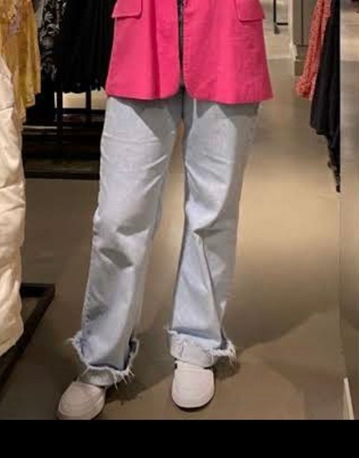 Bol kesim, bağlama desenli pembe pastel tonlarında kadın kot pantolon. Midi boyda, günlük kullanım için rahat ve şık bir seçenek.