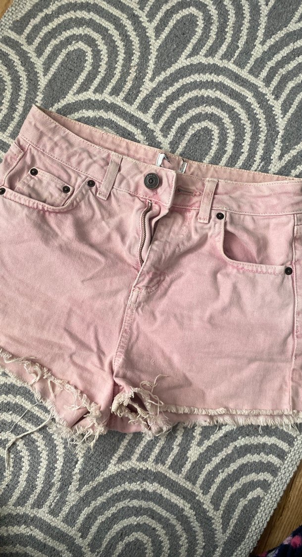 Pastel pembe renkte, düğmeli ve bağlama desenli kot şort. Bol kesim, mini boy ve yıpranmış etek ucu detayına sahip.
