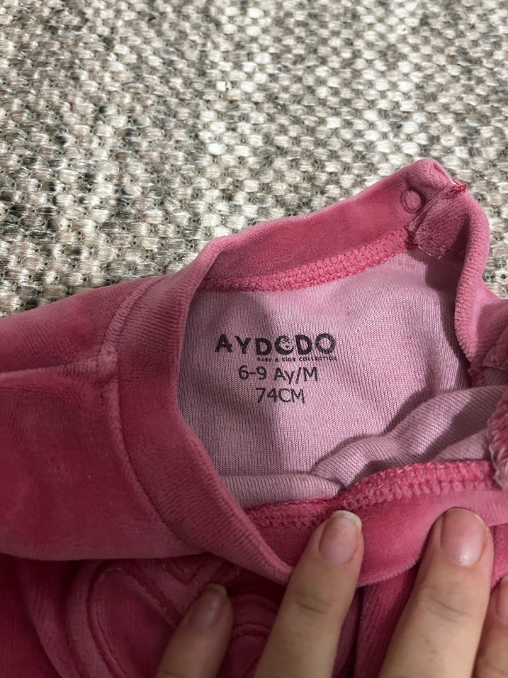 6-9 ay bebekler için pembe bağlama desenli, fermuarlı tulum. 74 cm beden, AYDCDO markasına ait. Kadife kumaş çok sıcak tutuyor