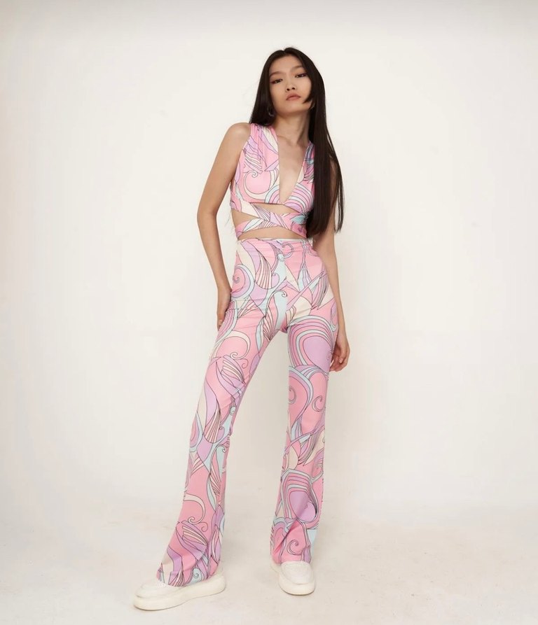 Sentetik kumaştan, pembe bağlama desenli, kadınlara özel ispanyol paça pantolon, parti için uygundur. Alt Üst Takım.