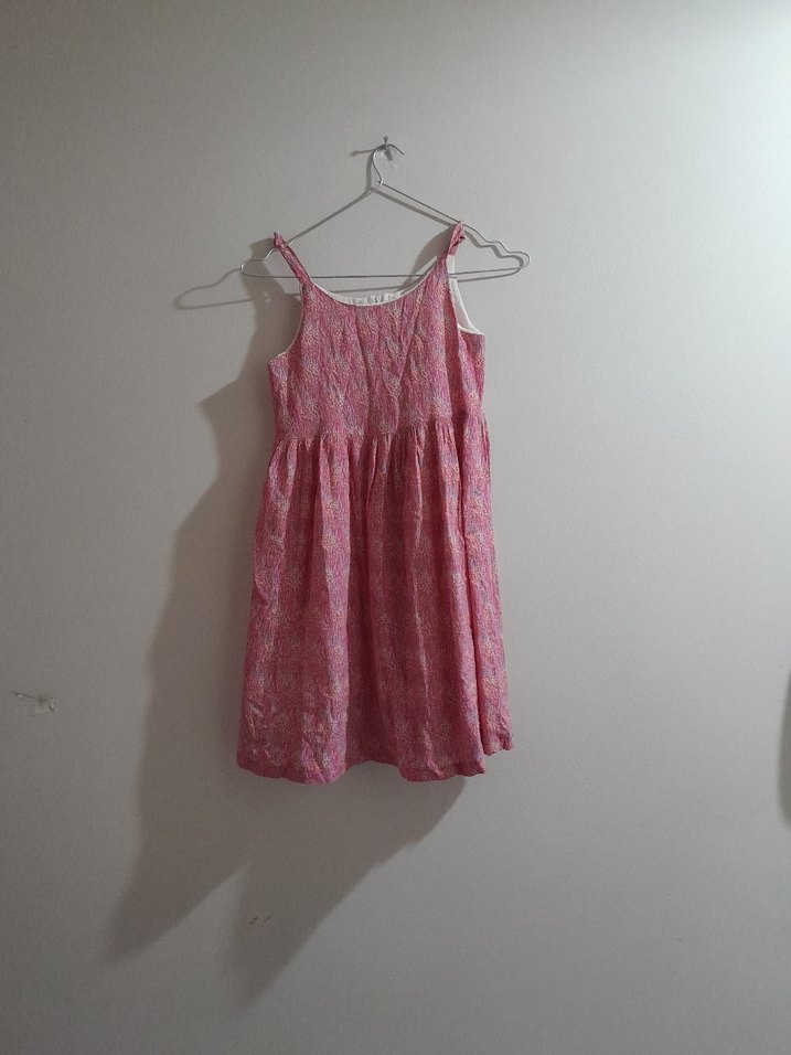 Pembe bağlama desenli keten kumaştan, askılı ve pileli, bol kesim kız elbisesi. Yumuşak ve nefes alabilir dokusuyla bohem tarzına uygun.