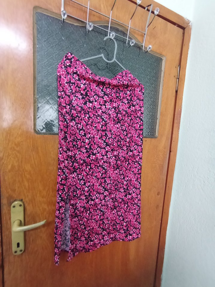 Sentetik kumaştan, drapeli ve bağlama desenli renkli pembe midi boyu, dar kesim kadın eteği.