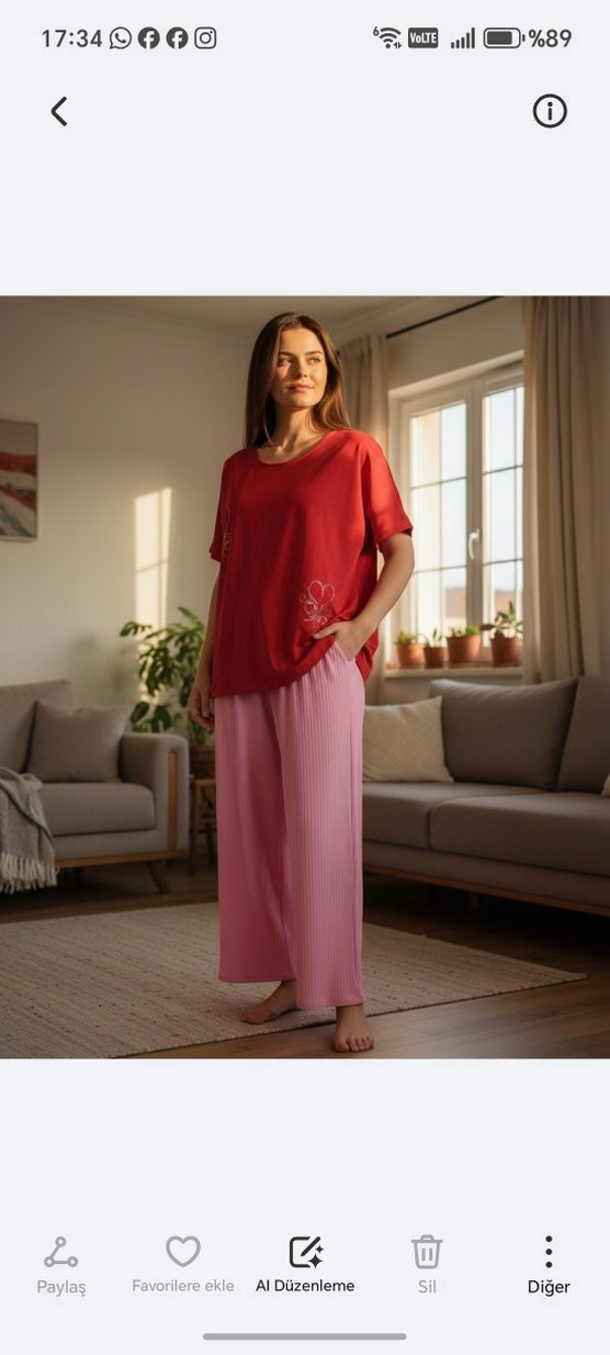 Pembe bağlama desenli, kısa kollu, normal boy, bol kesim kadın pijama takımı, rahat ve normcore tarzda.