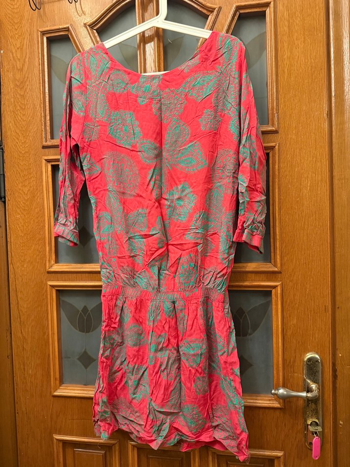 Renkli bağlama desenli hamile tunik, salaş kesim ve uzun boyda. V yaka, uzun kollu ve dökümlü tasarıma sahip, yumuşak sentetik kumaştan yapılmıştır. Penye mood markası