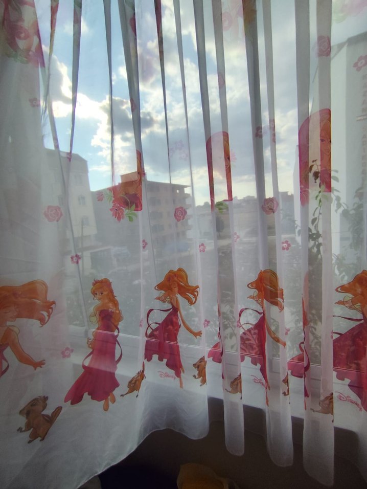 Pastel pembe bağlama desenli tül perde, çağdaş tarzda karakter baskılarıyla odanıza hafif ve neşeli bir dokunuş katıyor.