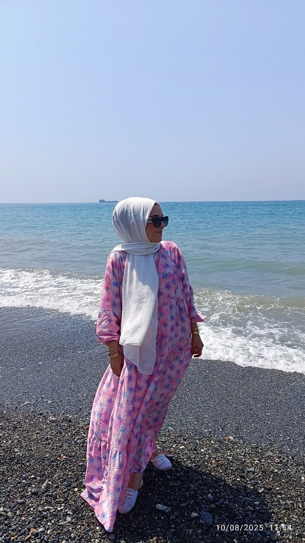 Pastel pembe bağlama desenli, pamuk dokulu, uzun elbise (ilk giyişim) 1 numara olmasına rağmen bol durduğu için satıyorum