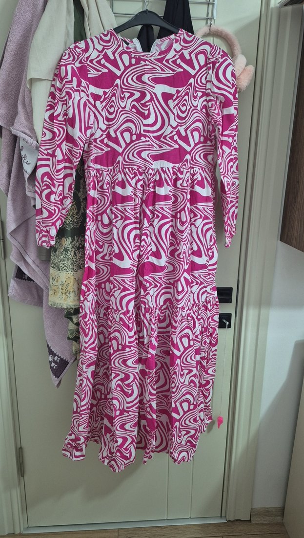 Renkli pembe bağlama desenli, bol kesim uzun elbise. Yumuşak sentetik kumaştan, V yakalı ve askılı kollu, bohem stil için uygun.