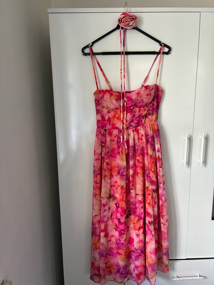 Pembe bağlama desenli uzun ince askılı elbise