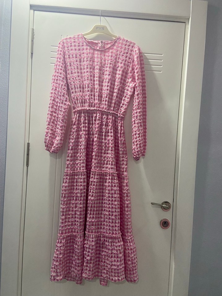 Pembe bağlama desenli uzun elbise, volan detaylı, uzun kollu ve yuvarlak yakalıdır. Rahat kesimi ve yumuşak sentetik kumaşıyla bohem tarz sunar.