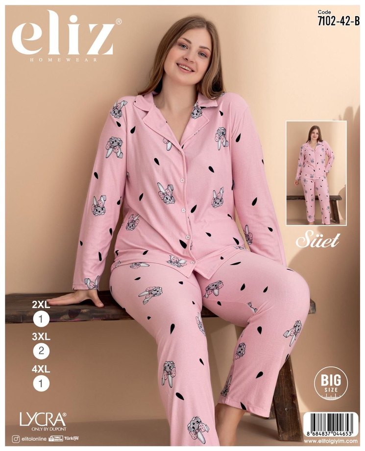 Bol kesim, pembe renkli, uzun kollu ve midi boy pijama takımı. Bağlama desenli ve sevimli tavşan baskılı rahat bir model.