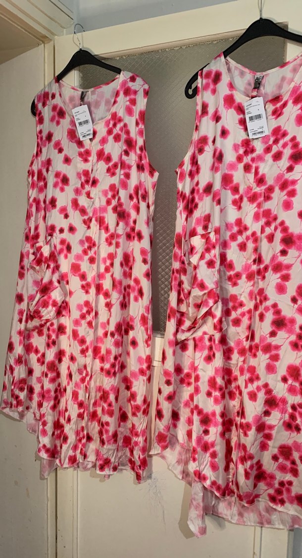 Pembe bağlama desenli, kolsuz uzun elbise, volan detaylıdır. V yakalı, bol kesim ve yumuşak sentetik kumaştan yapılmıştır, bohem Paris tarzını yansıtır.