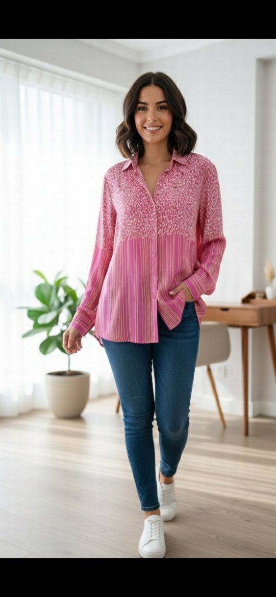 Pembe renkli, bağlama desenli, uzun kollu ve V yakalı kadın gömleği. Düğmeli ve bol kesimdir, yumuşak sentetik kumaştan üretilmiştir. Günlük kullanıma uygundur.