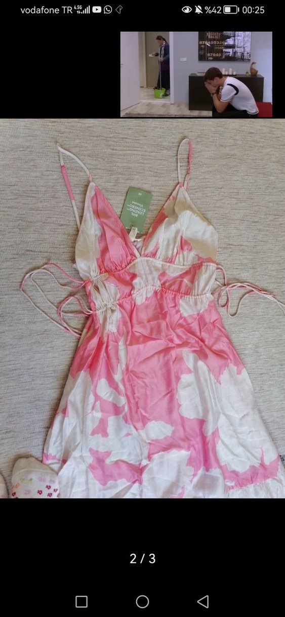 Pembe tie-dye desenli, askılı, yaka ve bağlamalı detaylı midi boy h&m marka