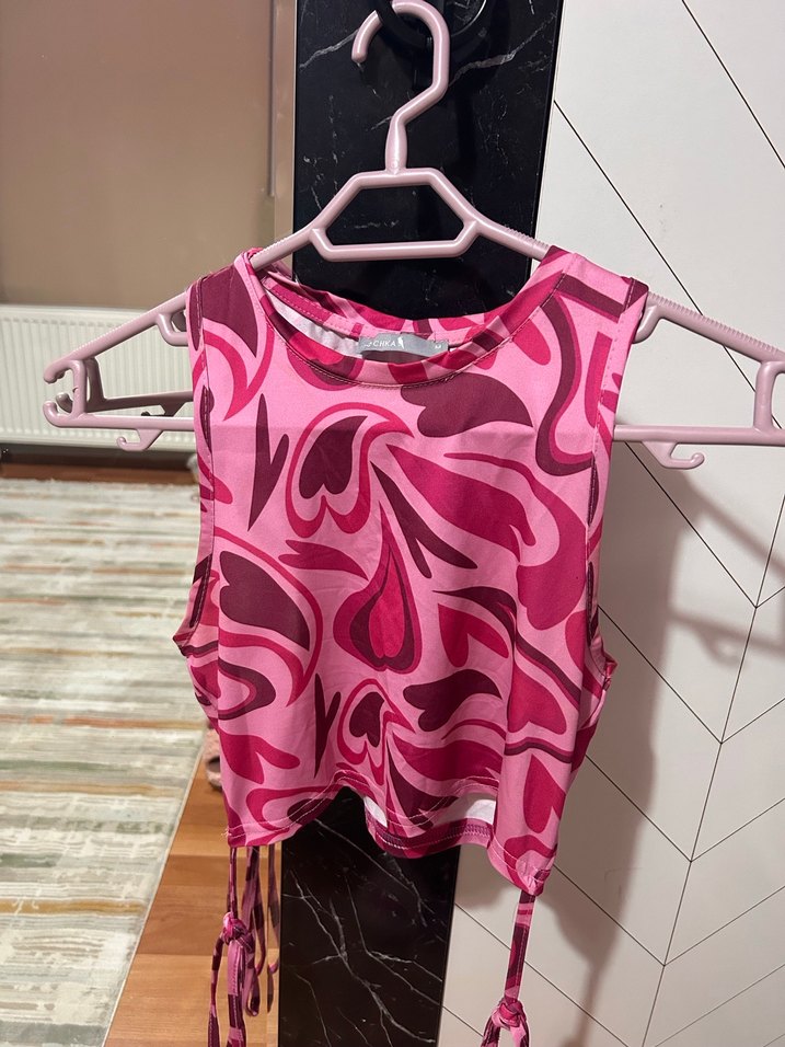 Pembe bağlamalı, salaş kesim, kolsuz crop top. Bağcıklı ve halter yaka detaylı, günlük sokak stili için uygun.