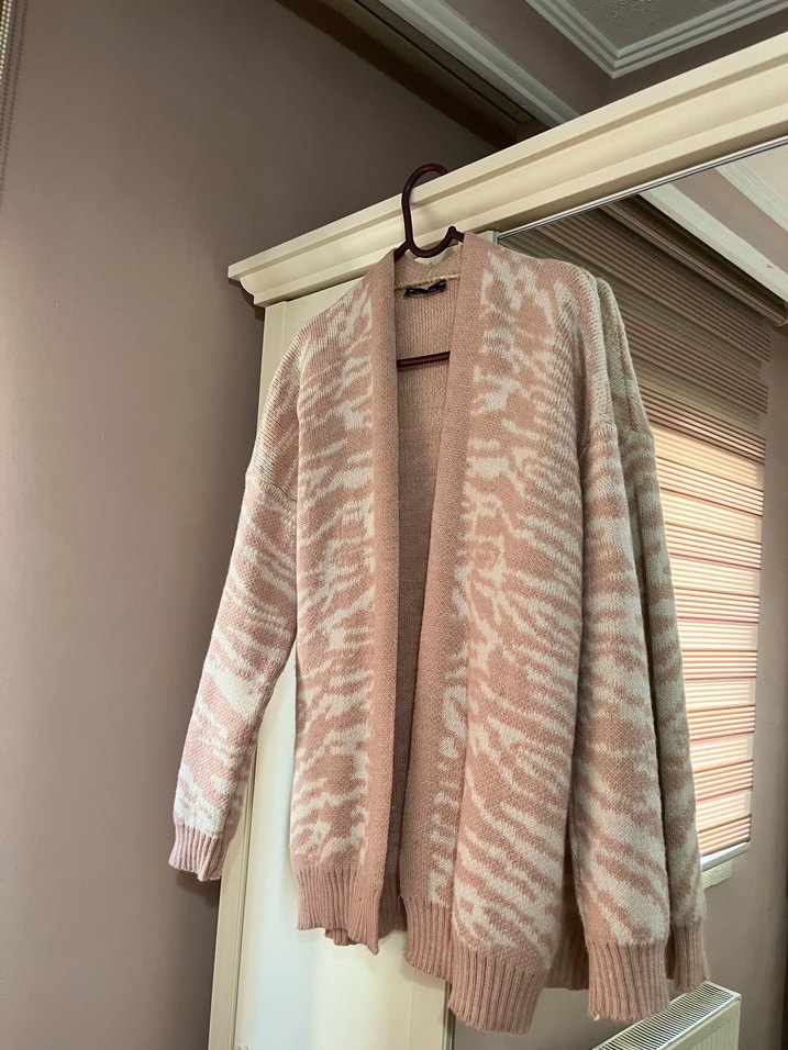 Pembe, bağlamalı desenli midi uzunlukta, uzun kollu, bol kesim hırka. Yumuşak sentetik kumaştan, kürk detaylı, bohem tarzda günlük rahatlık sunar. mve l beden