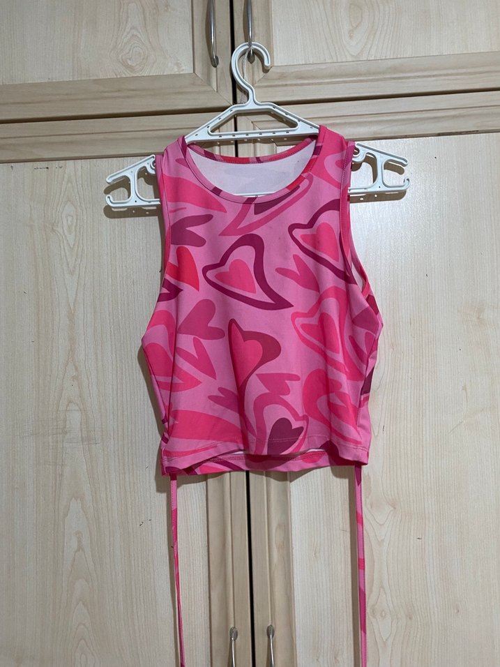 Kolsuz, pembe bağlamalı crop top. Sentetik kumaştan, kısa ve vücuda oturan kesimde, bağlamalı detaylı. Outdoor sokak stili için uygun.