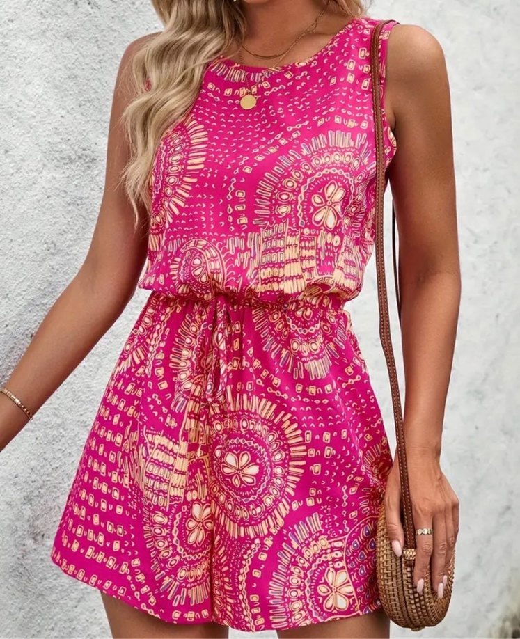 Canlı pembe renkli, kolsuz, yuvarlak yaka ve dantel detaylı, bağlamalı, bol kesim mini tulum. Yumuşak sentetik kumaştan, bağlama desenli, açık hava kullanımı için uygundur.
