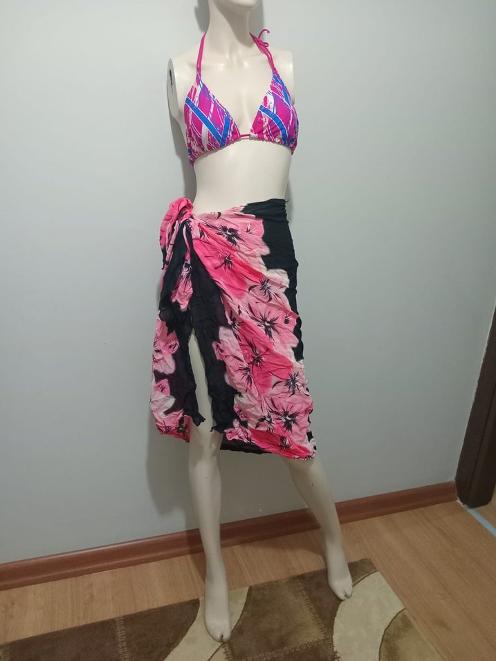 Bu pembe bağlamalı mini pareo, koyu pembe batik desenli ve drapeli bohem tarzda tasarlanmıştır. Plaj için uygundur.