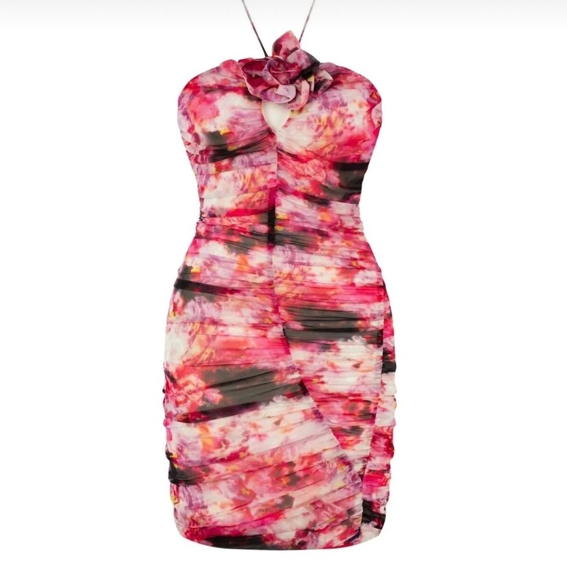 Pembe bağlamalı mini elbise, straplez yakalı ve kolsuzdur. Drapeli ve vücuda oturan kesimiyle çağdaş ve avangart bir tarz sunar. Romantik akşamlar için uygundur.