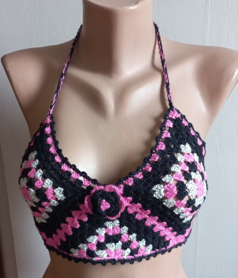V yaka ve ince askılı, pembe bağlamalı örgü kumaştan yapılmış, bohem tarzda kısa ve vücuda oturan kadın büstiyer.