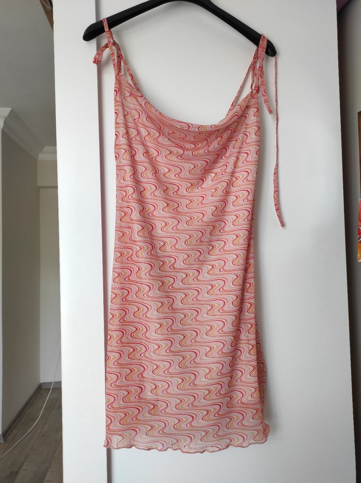 Pembe Bağlamalı şifon askılı elbise desenli