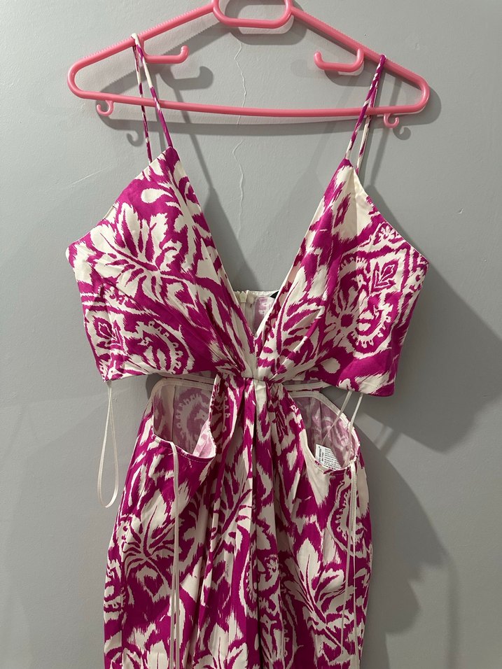 Pembe renkte, ince askılı tulum, bağlamalı ve drapeli tasarımıyla bohem tarzını yansıtıyor.