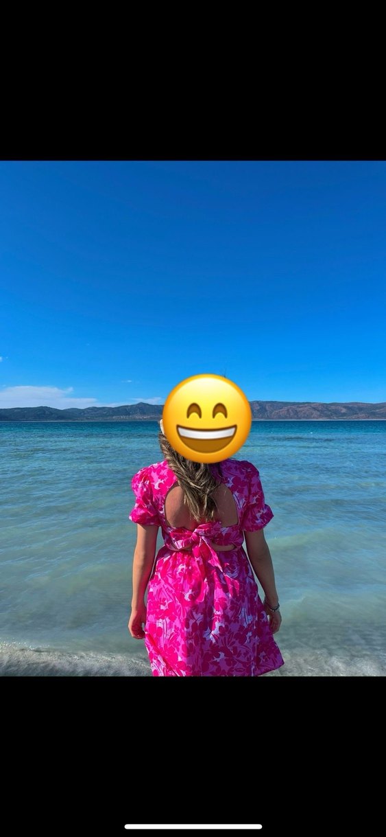 Pembe bağlamalı elbise, parlak batik desene, V yaka ve kabarık, askılı kollara sahiptir. Salaş kesimli ve sırt bağlamalıdır, bohem plaj stili için uygundur.