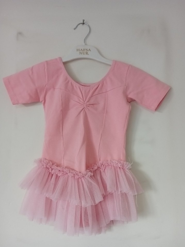 Pembe renkli, kısa kollu ve bisiklet yaka kız çocuk elbisesi, etek kısmında kat kat fırfırlar bulunur. bale elbisesi 2 4 yaş