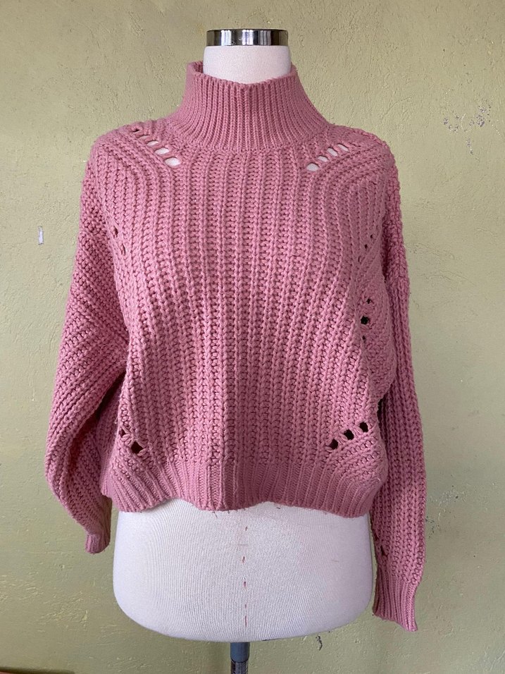 Pembe renkli, balıkçı yaka ve uzun kollu örgü kadın kazak, rahat ve salaş kesimiyle günlük kullanıma uygundur.