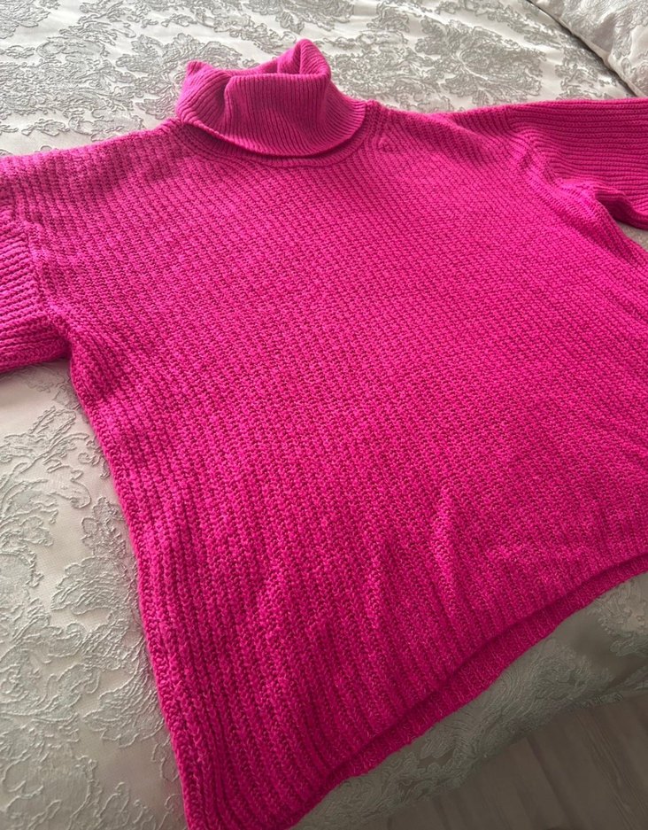 Pembe renkli, balıkçı yakalı ve uzun kollu örgü kazak. Bol kesim, parlak dokusu ve normal midi boyu ile günlük kullanıma uygun.