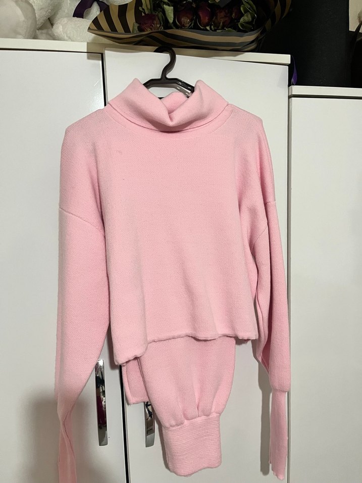 Pembe pastel tonlarda balıkçı yaka ve uzun kollu, fitted kesim kadın kazak. Yumuşak, örgü fleece kumaştan, rahat ve şık sokak stili için uygun.